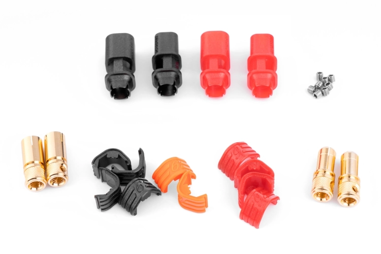Zlacené 6mm konektory s domkem pro 8,4mm2 (8AWG) kabel. Konstantní proud 240A, špičkový 280A. Nepájecí varianta - kabel je zajištěn pomocí dvou imbusových červíků. Balení 2 páry (1 červený a 1 černý).