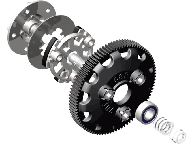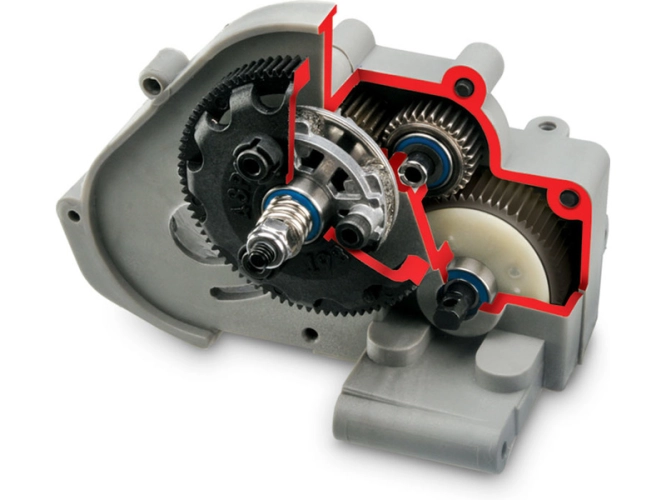Převodovka, disková spojka a planetový diferenciál jsou uzavřeny do jednoho kompaktního celku. Převodovka s třecí spojkou spolehlivě přenáší výkon motoru na nápravy, planetová převodovka diferenciálu Magnum 272™ má ozubená kola vyrobená z kalené oceli. Tento systém vyžaduje naprosto minimální údržbu. K dispozici jsou pastorky a ozubená kola s různými počty zubů, takže si můžete model přesně vyladit pro rychlostní i technické tratě.