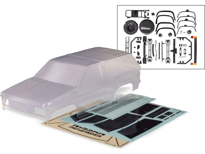 Traxxas karosérie TRX-4 Nissan Pathfinder 1988 čirá (bezsponková). Vyžaduje barvení. Včetně masky chladiče, zrcátek, klik dveří, stěrčů a předního a zadního nárazníku. Rozvor 312 mm. Určeno pro montáž na blatníky TRA8080X.
