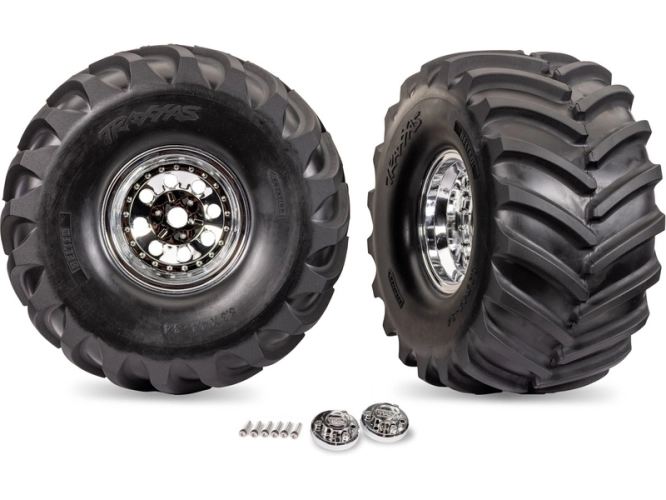 Kompletní kolo 8.3 x 4.4/3.4" pro RC modely aut 1:5 (pár). Disk X-Monster chromovaný. Pneumatiky Terra Groove jsou vybaveny lehkým pásem v kostře, který zabraňuje vyboulení při vysokých rychlostech.