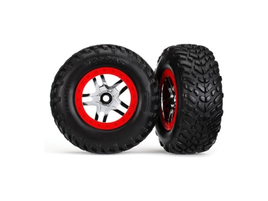 Kompletní zadní kola pro 2WD, přední i zadní kola pro 4WD RC auta Traxxas Slash (S1 super měkká směs). Disky Split-Spoke stříbrné s červenými ráfky a nalepené pneumatiky SCT. Rozměr disku 61/81x42 mm. Celkový rozměr 110x46 mm. Unašeč je šestihran 12mm s offsetem 24 mm.