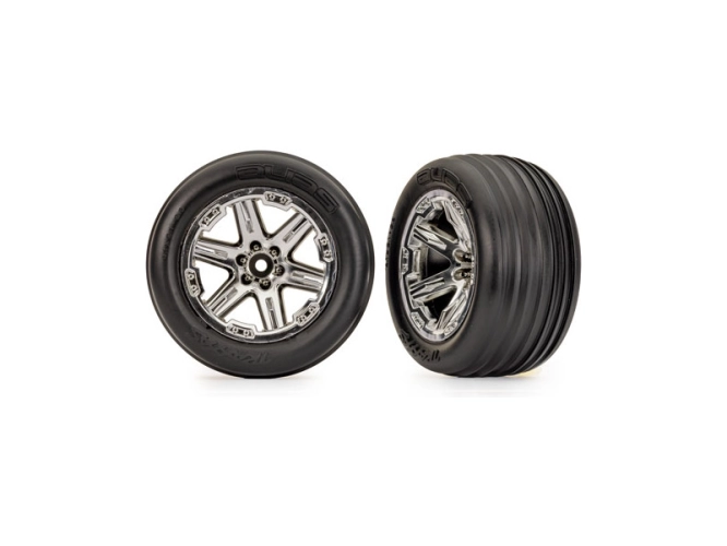 Kompletní kola (přední) pro RC modely aut (2ks). Disky 2.8" RXT chromované s nalepenými drážkovanými pneumatikami a vložkou. Rozměr disku ø71 mm, unašeč šestihran 12 mm.