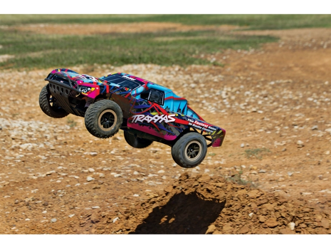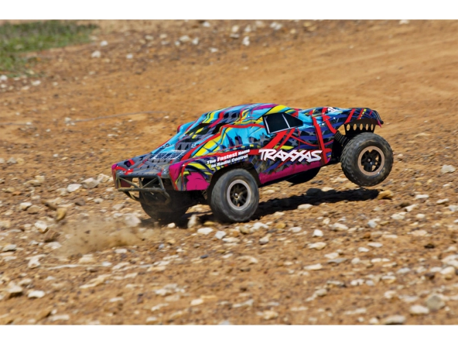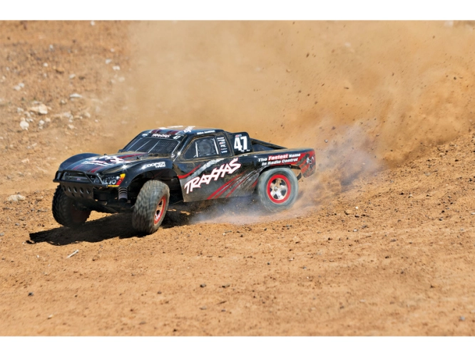 RC auto TRAXXAS Nitro Slash s výkonným spalovacím motorem TRX 3.3 dokáže hravě modelu udělit rychlost až 80 km/hod. Užijte si ryzí jízdu se spalovacím Nitro motorem! Odolný a osvědčený podvozek modelu Slash je zárukou výborných jízdních vlastností. Dokonalé ovládání i ve vyšších rychlostech zajistí dvoukanálová RC souprava v pásmu 2.4 GHz s elektronickou stabilizací jízdy TSM.
