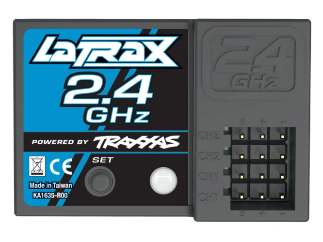 Tří-kanálový přijímač Latrax 2.4 GHz, zajišťuje bezpečné řízení bez výpadků. Snadné spárování jedním tlačítkem. Indikace stavu pomocí LED diody.