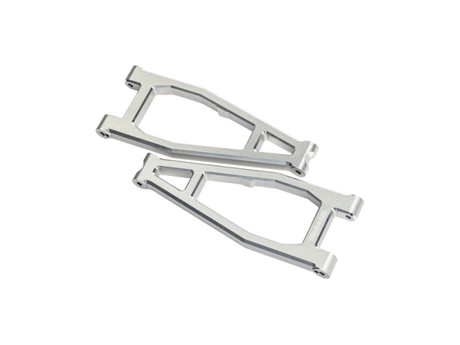 Tuningový díl pro RC modely aut Traxxas 1:5/1:6 (Funco): rameno podvozku horní přední hliníkové stříbrné (2). Vyrobeno z velmi odolného hliníku 6061-T6, šroub 3x8mm BCS (8).