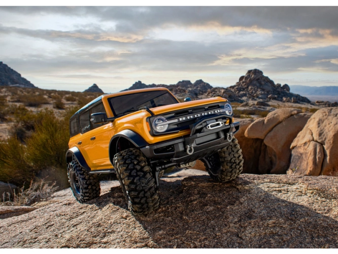 Americká legenda je zpět v novém moderním kabátě. Po 25 let se vrátil Ford Bronco jako nejvýkonnější off-road model této značky a jedno z nejvyhledávanější amerických SUV. Traxxas převedl ducha této ikony do svého auta na dálkové ovládání. Na osvědčeném šasi TRX-4 je instalována zcela nová licencovaná karoserie Fordu Bronco 2021. Karoserie je nově bez-sponková. Krásné křivky detailní karoserie s čirými okny, sklopnými zrcátky, stěrači, klikami a rezervním kolem, již neruší sloupky se sponkami. Karoserie je také nachystána na montáž originálního osvětlení Pro Scale (prodává se samostatně), se všemi funkcemi jako reálné auto (funkční směrovky, brzdová světla, zpátečka, různá intenzita světlometů, koncová světla).