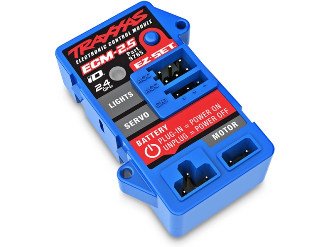 Nová řídící jednotka ECM-2.5 v sobě integruje regulátor i s přijímače. Elektronika je chráněna ve voděodolné* krabičce. Obsaženy jsou funkce: LVD – ochrana proti podvybití LiPo akumulátoru, snadné nastavení jedním tlačítkem EZ-Set a 3 speciální jízdní režimy.