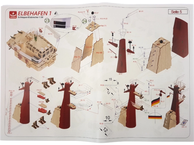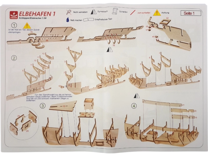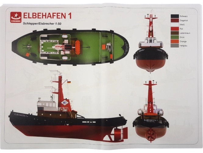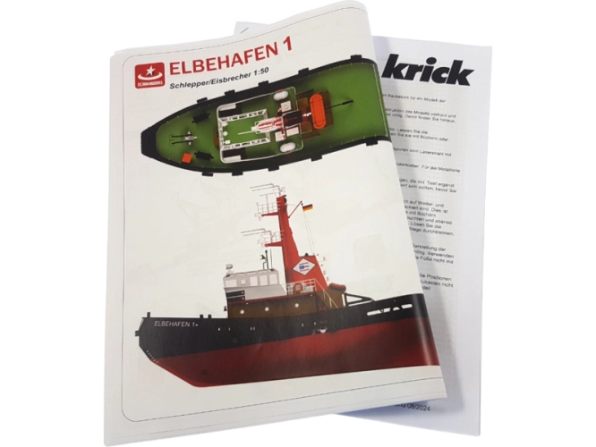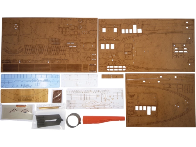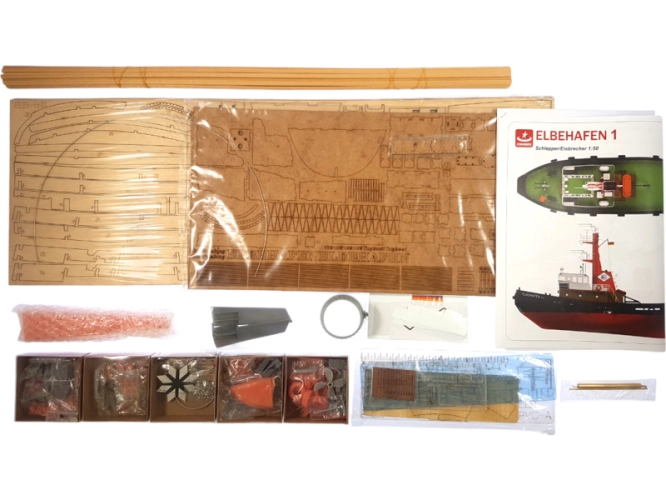 Stavebnice makety lodi Elbehafen 1 v měřítku 1:50. Délka modelu 605 mm. Stavba lodi je vhodná pro pokročilé modeláře. Model obsahuje díly k výrobě, jako dřevěný překližkový trup doplněný o lišty opláštění a paluby. Dřevěné díly jsou přesně a čistě laserem řezané. Dále model obsahuje kvalitní díly z resinovaného 3D tisku a maketové a konstrukční díly. Součástí stavebnice je stavební plán. Konstrukce je klasická s kýlem, příčnými žebry a plaňkovým opláštěním. Do modelu je možné doplnit LED osvětlení, což je v manuálu naznačeno (obsaženy jsou samotné LED a odpory, další elektrické komponenty a akumulátor je nutné doplnit).