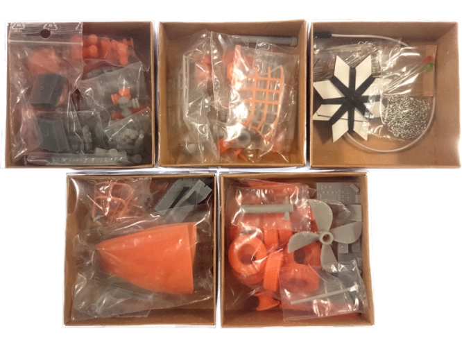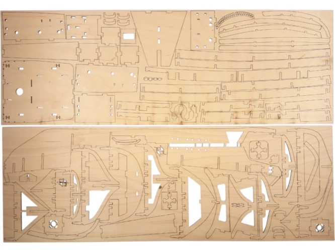 Balení obsahuje díly pro stavbu lodi: díly z překližky, lišty, laserem řezané dřevěné díly, maketové díly z 3D tisku, z plastu, kovu apod., samolepky, obrázkový manuál EN.