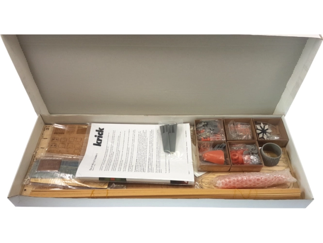 Po otevření víka krabice naleznete obsáhlou sadu dřevěných dílů modelu z překližky, sadu lišt, součásti 3D tisku v blistru, obrázkový návod.