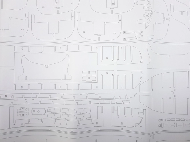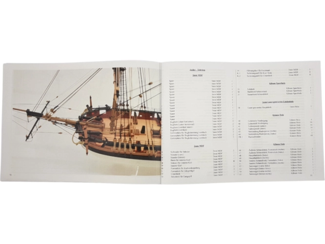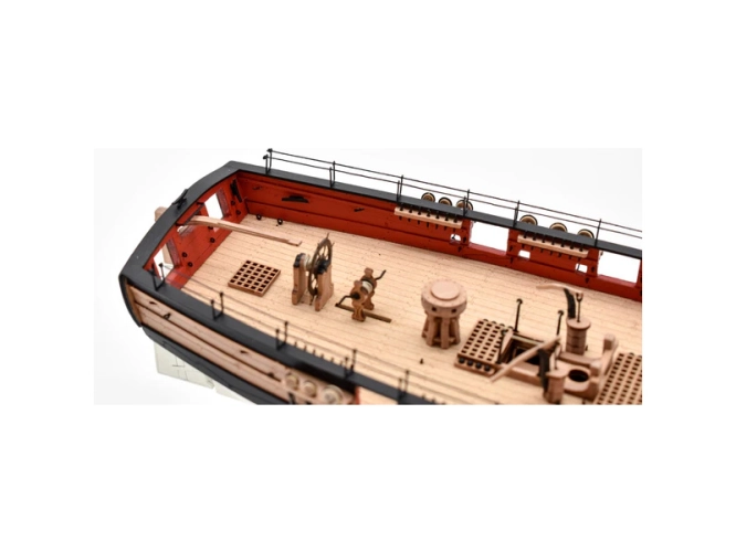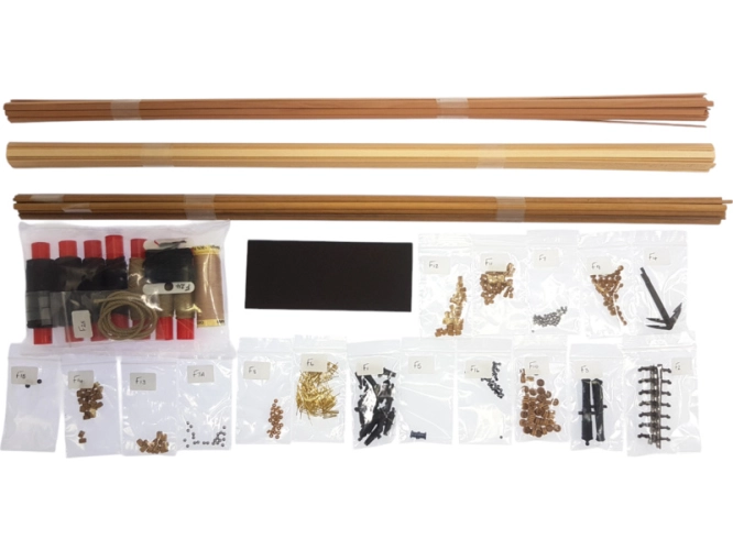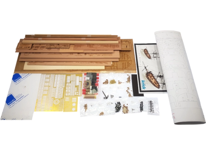 Balení obsahuje laserem řezané dřevěné a plastové díly, plaňky, lišty, paluby, stožáry, dekorace, 3x mosazné fotolepy, lanoví, 3D tištěné díly. Podrobný obrázkový manuál EN a stavební plány.
