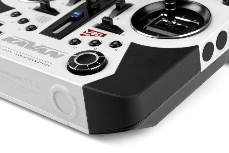 Pro ovládání dalších funkcí slouží 6 třípolohových přepínačů, 2 dvoupolohové (1 momentový) přepínače, 2 postranní otočné ovladače, 6 uživatelsky programovatelných tlačítek (vpředu) a dvě momentová tlačítka (vzadu). Vestavěný 6osý gyroskopický senzor lze nastavit pro ovládání kanálu plynu, řízení výchylek mixu a slouží i pro probuzení displeje. Páčky trimů a knoflíky jsou celokovové, precizně obráběné na CNC. Návrh rozmístění ovladačů a ergonomie těla je výsledkem několika desítek hodin testování a ladění týmem KAVAN.