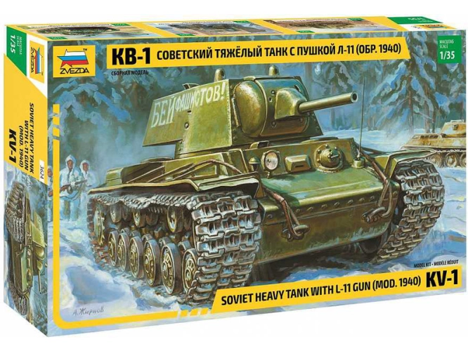 Plastikový model Zvezda 3624 - sovětský těžký tank M1940 s kanónem L-11 KV-1 v měřítku 1:35 ke slepení. Stavebnice obsahuje 243 dílků, délka 190 mm.