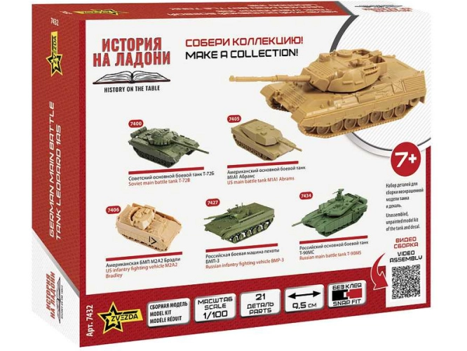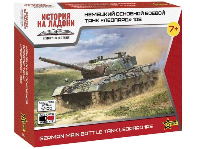 Plastikový model tanku Zvezda 7432 - Leopard 1A5 v měřítku 1:100 ke slepení. Stavebnice obsahuje 21 dílků, délka modelu je 95 mm.