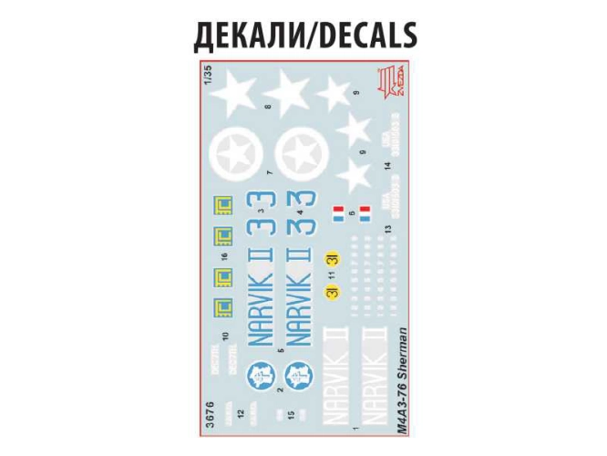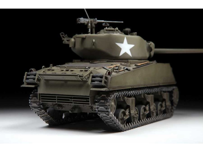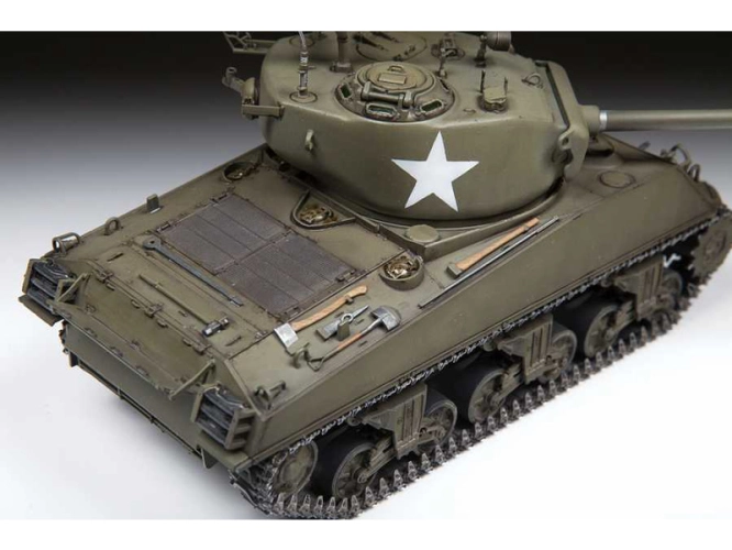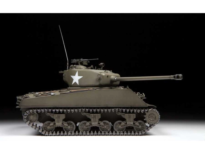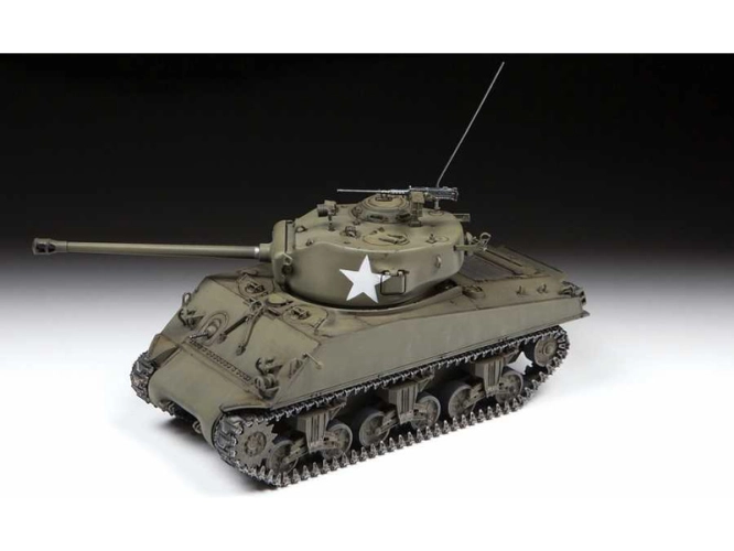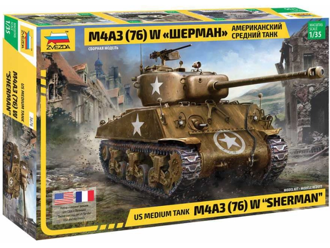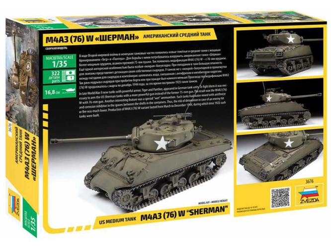 Plastikový model Zvezda 3676 - tank M4 A3 ( 76 mm ) Sherman v měřítku 1:35 ke slepení. Stavebnice obsahuje 322 dílků, délka 168 mm.