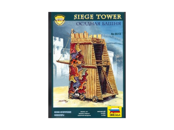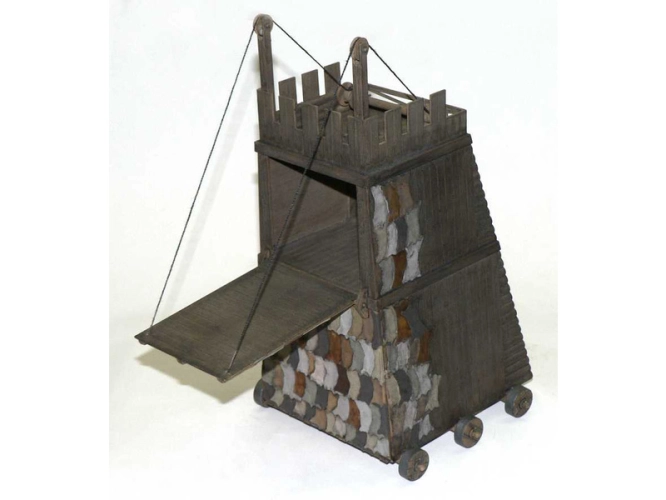 Model obléhací věže ke slepení. Měřítko 1:72. Počet dílků 51. Velikost 9x11x17,7 cm.