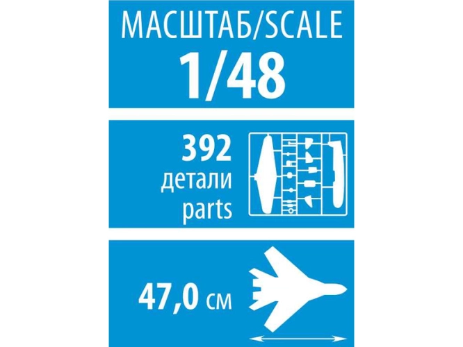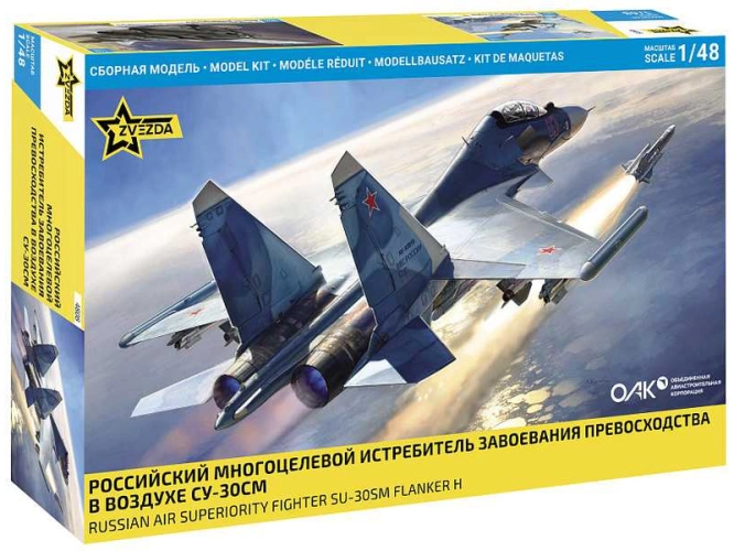 Plastikový model stíhačky Zvezda 4808 - Suchoj Su-30SM v měřítku 1:48 ke slepení. Stavebnice obsahuje 392 dílků, délka modelu je 47 cm.