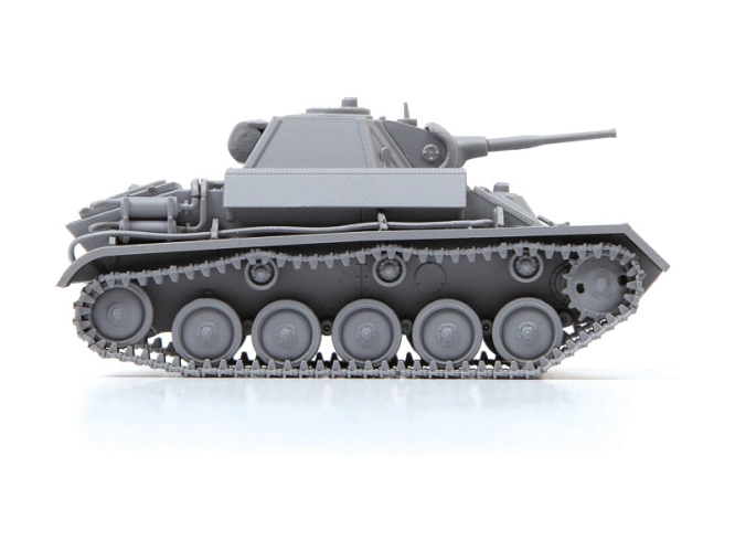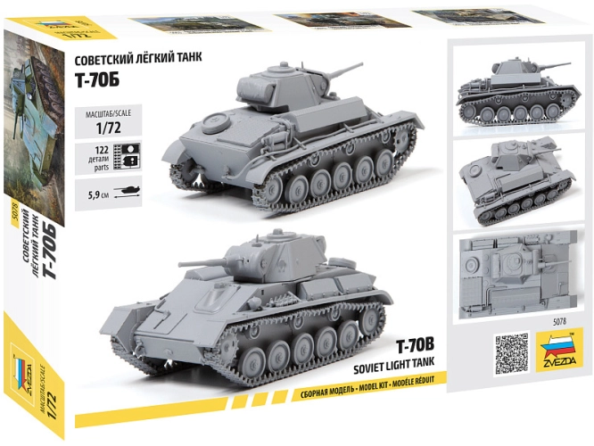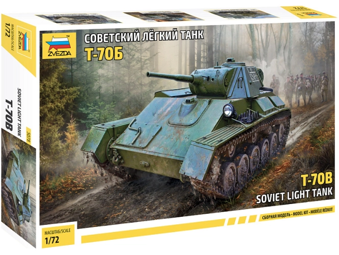 Zvezda plastikový model sovětského lehkého tanku T-70 v měřítku 1:72 ke slepení. Stavebnice obsahuje 122 dílků, délka 59 mm.
