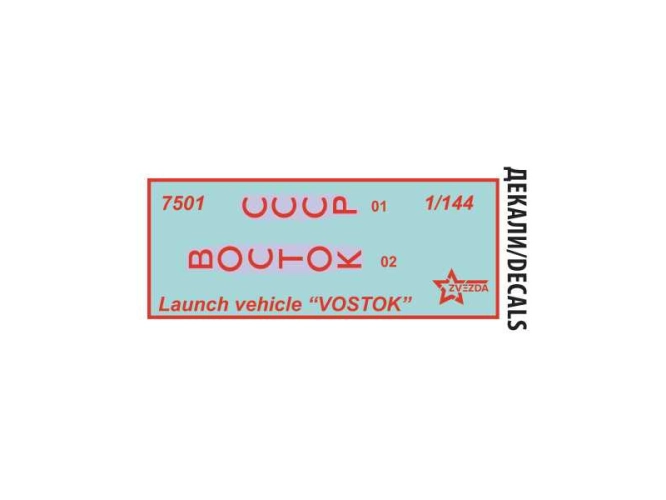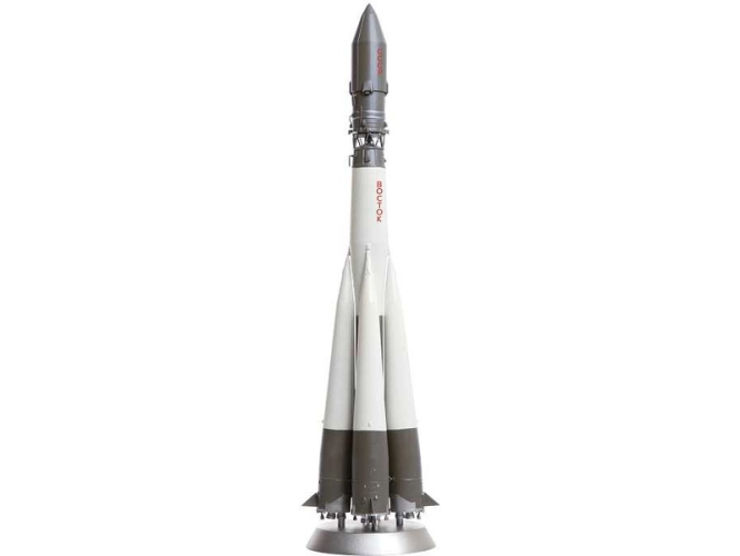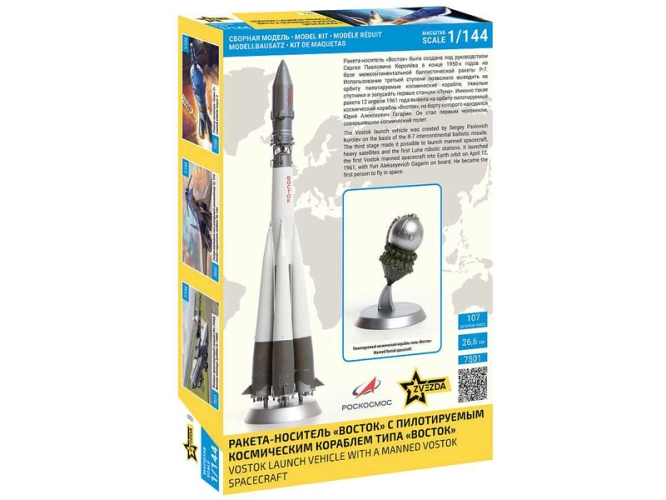 Plastikový model vesmírné rakety Zvezda 7501 - Vostok 1 v měřítku 1:144 ke slepení. Stavebnice obsahuje 107 dílků, délka modelu je 26,6 cm.