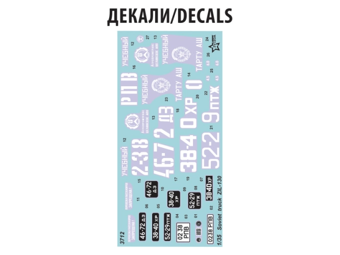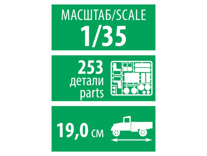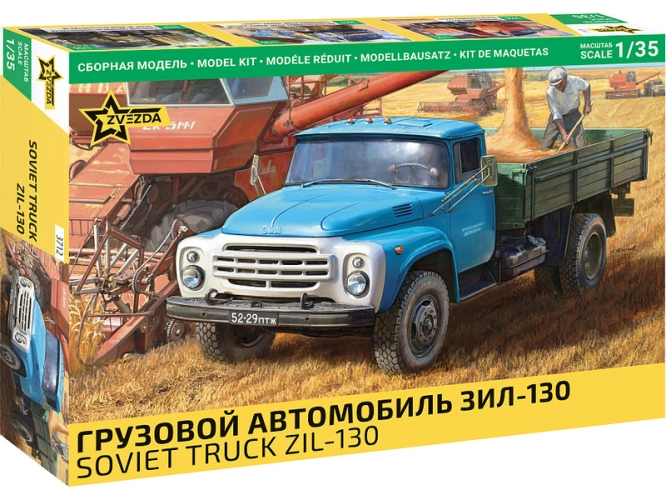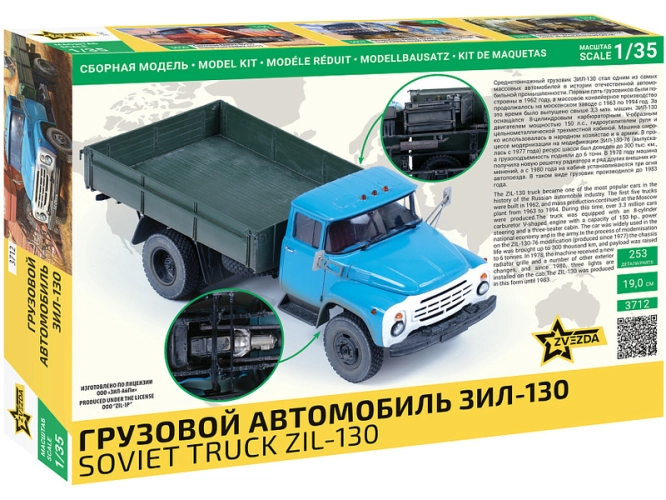 Plastikový model Zvezda 3712 - nákladní auto ZIL 130 v měřítku 1:35 ke slepení. Stavebnice obsahuje 253 dílků, délka 190 mm.